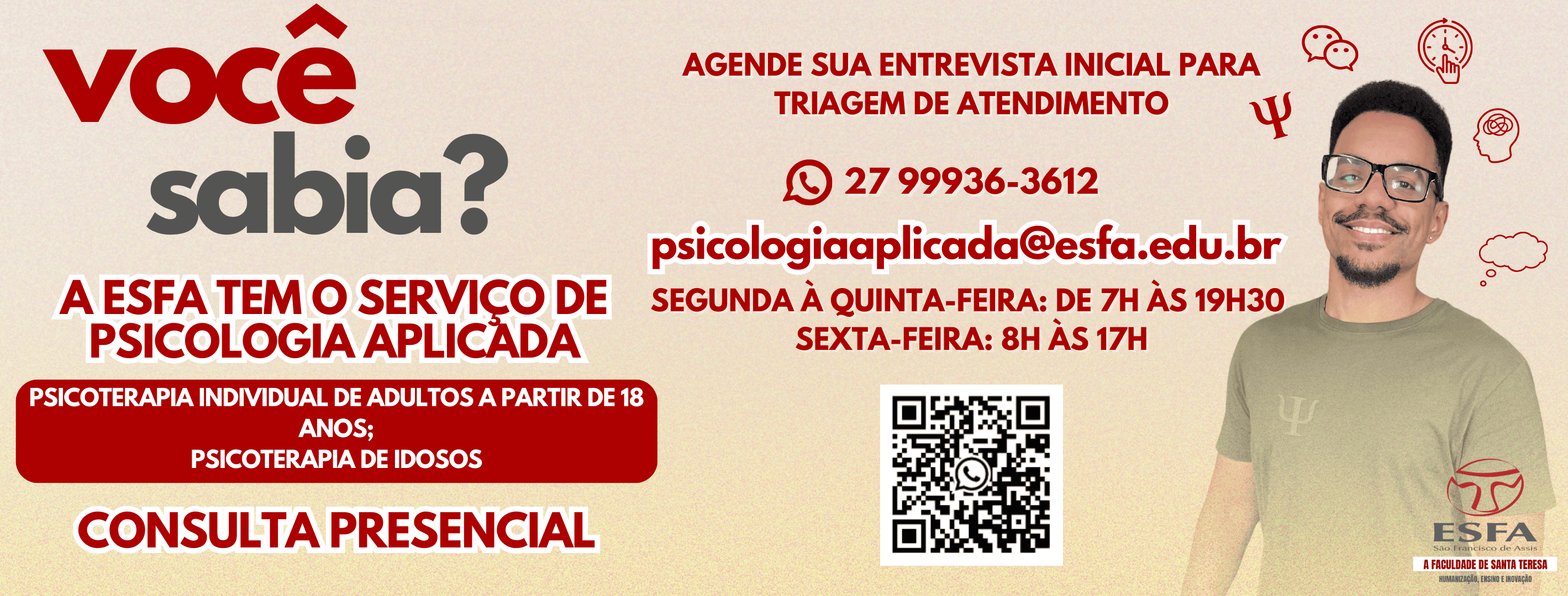 O ano de 2025 já começou, e a Clínica Escola de Psicologia da ESFA está pronta para receber você! O Serviço de Psicologia Aplicada (SPA), pertencente ao curso de Psicologia da instituição, oferece atendimento psicoterapêutico para toda a comunidade, com valores acessíveis e qualidade garantida.